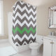 Cortina de ducha de zigzag gris y blanco cálida con una franja acentuada verde.