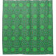 Esta cortina de ducha, en su mayoría de color verde, tiene un diseño decorativo al estilo caleidoscopio de los árboles de Navidad. Los diseños son rojos, blancos y azules y forman un patrón circular.