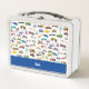 Añada un toque divertido al día de su niñito con esta adorable lonchera de la escuela personalizado que celebra todo lo que se mueve: camiones de bomberos, autos de la policía, helicópteros y aviones, trenes, taxis, vehículos de construcción, y más! Añade el nombre de tu hijo para un toque personal. Esta caja de almuerzo también hace un divertido cumpleaños personalizado, de vuelta a la escuela, Navidades u otro regalo de vacaciones.