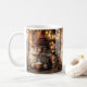 Un bonito gnomo con un gorra naranja de punto, vasos redondos y una barba blanca esponjosa que disfruta de una taza de cacao caliente. El lugar se encuentra en una acogedora cafetería rústica con suaves texturas de madera, cálidas lámparas de boquilla doradas al fondo y un ambiente relajado.
