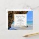 Invitación postal de la fiesta de cumpleaños con una fotografía pintoresca de la naturaleza. Bonito mar azul turquesa con una playa de arena. Una gran roca marrón da sombra al cielo azul intenso.