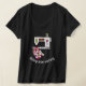 Camiseta de tee oscura para las damas, con gráficos personalizados de una máquina de coser y un edredón. El texto en blanco dice picor para ser cosido y puede ser personalizado para leer lo que quiera.