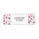 Una etiqueta de dirección con un diseño temático de costura que consiste en una máquina de coser, botellas de hilo, un cojín de alfiler, tijeras, manchas de tela y agujas de coser. El diseño tiene un esquema de color rosa.