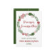 Corona de Navidad verde y roja, tarjeta de Navidad, con las palabras Feliz Navidad en letón: Priecīgus Ziemassvētkus.