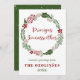 Corona de Adviento verde y roja de las fiestas de Navidad, tarjeta de vacaciones con las palabras Feliz Navidad en letón: Priecīgus Ziemassvētkus.