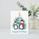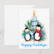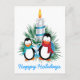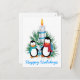 Diseño de costumbre de Navidad de pingüinos y velas con dos pingüinos con bufandas, una vela, agujas de pino y el texto ”Feliz Navidad”. Diseño navideño invernal adorable.
