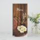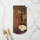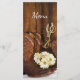 Personalizar el encantador Cowboy Boots, Daisies y Horse Bit Country Wedding Menu con los detalles de la comida que se servirán en su rústica fiesta de compromiso con el rancho, almuerzo con ducha de novia o cena en la recepción matrimonial añadiendo la ensalada o primer curso, entrante o segundo y postre o tercer curso. Este menú nupcial, de temática personalizado, informal pero elegante, presenta una pintoresca fotografía floral de un par de botas de vaquero de cuero, ramo de flores de margarita blancas y amarillas, collar de perlas blancas, trozos de caballo y riendas de cuero con un fondo de granero marrón.