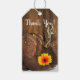 Gracias a sus invitados por ser parte de su fiesta informal pero elegante, ducha de novia o matrimonio cuando asocian los rústicos Cowboy Boots, Daisy y Horse Bit Country Wedding Favor Tag a su favor de fiesta o pequeño regalo. Estos sellos casuales de personalizado para la boda ecuestre incluyen una pintoresca fotografía floral de un par de botas de vaquero, flores de margarita naranja y amarilla, collar de perlas blancas, trozos de caballo y riendas de cuero con fondo de granero marrón.
