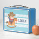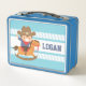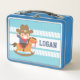 ¡Yee Haw! Una caja de almuerzo personalizada para el chico que ama los temas del vaquero occidental! Este diseño viene con el ilustracion personalizado de un lindo y feliz niño vestido con ropa de vaquero occidental completa con gorra que tiene una estrella de sheriff. Él está montando un juguete mecedor.