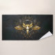 Dibujado artísticamente, simétrico, composición de negro y oro, alas de pájaro, dorado, cráneo de pájaro decorado con motivos dorados sobre fondo oscuro, texturado.Estilo gótico