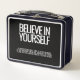 Almuerzo metalizado premium con un audaz diseño en blanco y negro que dice "Créante en ti mismo" y presenta una cita motivacional: "Un pájaro sentado en un árbol nunca tiene miedo de que se rompa la rama, porque su confianza no está en la rama sino en sus propias alas". Duradero y práctico, esta lonchera es perfecta para la escuela, el trabajo o como impulso diario a la confianza. Ideal para cualquiera que quiera llevar estímulo y positividad dondequiera que vaya.
