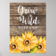 Arte de pared rústico y campestre para cuarto de niños o guardería con girasoles pintados con acuarela sobre fondo de madera. El texto dice "Crece Salvaje" en fuente de escritura caprichosa. Personalice este producto agregando el nombre de su hijo.