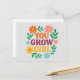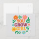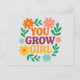 Un diseño de tarjetas de felicitación vibrante y edificante que incluye la frase "Usted crece Chica" en negrita, letras modernas rodeadas de flores brillantes, ilustradas digitalmente y exuberante vegetación. Perfecto para celebrar logros, enviar aliento o dar regalos a los amantes de las plantas y las flores.