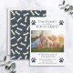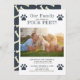 Anuncie su nuevo bebé de piel con estilo con esta linda tarjeta de invitación fotográfica, que muestra su foto en el medio. Cute azul marino con letras de la mano y moderna sans serif tipografía anuncian '¡Nuestra familia ha crecido por 4 pies!', con tu encuentro y la invitación de bienvenida a continuación. La parte delantera está decorada con garras de acuarela, y la parte trasera tiene un patrón óseo de acuarela sobre el azul marino. Copyright Elegant Invita, todos los derechos reservados.