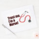 Pegatinas divertidos con un estetoscopio rojo y plateado junto a las palabras "Créanme, soy enfermera", perfecto para repartir en la próxima convención de enfermeras! También sería ideal para alguien que recientemente se graduó de la Facultad de Medicina. Personalización: Puede elegir una forma diferente, agregar su propio texto o imágenes, o cambiar el tamaño del diseño actual, haciendo clic en el botón "Personalizar". Si no puede ver el producto o diseño que está buscando, póngase en contacto con nosotros utilizando el botón de "contacto" debajo de cualquier descripción del producto para discutir sus necesidades.