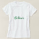 Camiseta blanca de mujeres con cita verde oscuro. El texto dice "Creer".