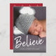Creer Letra Primera Navidad del Bebé Foto Moderna. Personalice este diseño de superposición de foto de letra a mano de moda con la palabra "Creer" en blanco. Una tarjeta de foto de vacaciones moderna y simple. Elke Clarke © La parte posterior tiene un diseño de patrón de árbol que puede eliminar si lo desea utilizando el menú de edición.