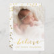 Los saludos de sus seres queridos se hacen fáciles con esta versátil y simple tarjeta de fotos de vacaciones con la palabra "Believe" escrita en un texto de escritura dorada con un efecto sombrío negro sobre su foto familiar favorita. Diseño de ELKE CLARKE© PARA MONOGRAMGALERY. Reemplace la foto de ejemplo con la suya propia.