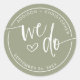 Guión caligráfico escrito a mano con la frase "hacemos" con largos intercambios en los extremos de las letras. Se muestra en texto blanco sobre un fondo verde sabio. Personalice la plantilla con sus nombres y fecha de boda. © Kimbellished, LLC