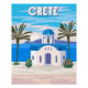 Creta Poster Travel, iglesia griega blanca con tejados azules, poster, antigua cultura y arquitectura de Europa mediterránea. Ilustracion de estilo vintage