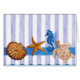 Diseño original pintado en acuarela por Sandra Gale, con estrellas de pescado, caballo de mar, tortuga y conchas sobre un fondo de rayas azules translúcidas verticales. Excelente diseño para el verano, casas de playa, bungalows o para todo aquel que ame la playa, el océano o el pescado.