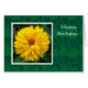 Un bonito crisantemo enmarcado en una plaza blanca bordeada sobre un fondo verde con motivos florales. Feliz cumpleaños escrito en el frente y dentro. (Los saludos en esta tarjeta se pueden personalizar).