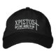 Diseño bordado en blanco sobre un tapón negro ajustable. Cristos está escrito en griego para el juego de palabras: "Él no es griego para mí". Exclusivamente de Biblewhiz.com.