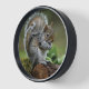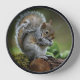 Curious Critter, una foto de primer plano de una ardilla gris encaramada en un tronco de las setas, mirando directamente a la cámara con una expresión curiosa. Su cola esponjosa está inflada y sus bigotes están temblando. Critter curioso