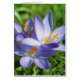 Elegante diseño floral. Flores de crocus púrpura en el fondo de césped verde, efecto de pintura