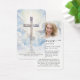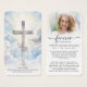 This elegant memorial prayer card features a radiant cross set against a peaceful sky and the editable comforting Bible verse from Matthew 11:28, “Come to me, all you who labor and are burdened, and I will give you rest.” on one side. The other side features your loved one's photo, a modern “Forever In Our Hearts” script design with name and dates and an editable heartfelt prayer. Ideal for funeral services, memorial gatherings or celebration of life ceremonies, this small 3.5x2" keepsake card offers comfort, reflection and remembrance for family and friends to carry as a reminder of their life and spirit. Personalization makes these cards unique.