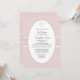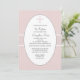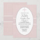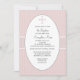 Un fondo de color rosa, moteado con pequeños puntos blancos, cuenta con un centro oval blanco con una cruz de color azul que mantiene tu redacción personalizada. La invitación es intersectada por una cinta ancha de textura recortada en blanco. Esta es una encantadora invitación para cualquier ocasión religiosa.