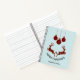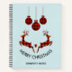Un cuaderno de espiral personalizado que dice "Feliz Navidad" en texto curvo. Diseñado con un ilustracion de 2 ciervos Navidades saltando. Los ciervos están hechos de leñadores rojos y negros, con un poco de corazón entre ellos. Las decoraciones de Navidad rojas y negras se cuelgan desde arriba.