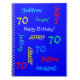 Qué maravilloso y personalizado bloc de notas en espiral del libro de invitados para una fiesta de cumpleaños número 70 o cualquier otra ocasión. En la portada, Name and Age se repite en diferentes tipos de letra y colores primarios sobre un fondo azul brillante. Fácil de personalizar: simplemente CAMBIAR NOMBRE, EDAD y OCASIÓN EN UN SOLO LUGAR. Admite un nombre de hasta 9 caracteres. Un colorido y divertido libro de invitados de cumpleaños - fácil de cambiar para CUALQUIER NOMBRE, CUALQUIER EDAD. Todos los derechos reservados © 2014 Alan & Marcia Socolik.