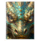 A notebook with an illustration of a gold and turquoise metallic looking dragon.