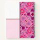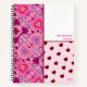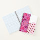 The artist's pattern design of pink and red elegant hearts and lines is on the side of the notebook, front and back. On the other is a white and pink square with a pink line in the middle. The pink square has a heart pattern, and the texts can be personalized by the customer.