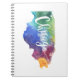 Características del este diseño un mapa del estado de los E.E.U.U. de Illinois que ofrece la ciudad de Chicago con una textura pintada a mano multicolora de la acuarela. Se añade "Chicago" stylized el texto overtop con una estrella para indicar la ubicación de la ciudad.