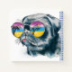Este diseño presenta un pug que mira a través de lentes de sol en una escena tropical.