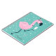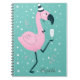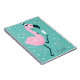 Flamencos rosas y copos de nieve sobre un fondo verde menta.