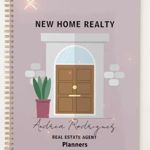 Este diseño de cuaderno elegante y moderno es perfecto para profesionales del sector inmobiliario. El estilo gráfico minimalista presenta una puerta principal estilizada con una ventana arqueada, flanqueada por apliques de pared y una planta en maceta. El texto en negrita sobre la puerta añade un toque profesional, mientras que el área personalizable debajo te permite personalizarlo con tu nombre y título. El fondo suave de color rosa pastel emana calidez y bienvenida, lo que lo convierte en un compañero ideal para tomar notas sobre la marcha.