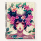 Journal in an illustration of a stylized anime girl with delicate features, her dark hair adorned with vibrant pink lotuses, lush green leaves, and a large white lotus crowning her head.