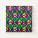 joyas, fondo del Mardi Gras de rhombus violeta y verde, lirios dorados decorados.