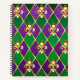 joyas, fondo del Mardi Gras de rhombus violeta y verde, lirios dorados decorados.