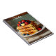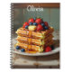 A sweet personalized notebook with a waffle theme. An illustration of waffles with strawberries, blueberries, syrup and butter on a pretty antique plate.