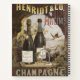 Anuncio de época para el champán Henriot & Co. Rheims con una copa de copas y dos botellas de champán en una vidriera con racimos de uvas; ave volando justo al aire libre con paisaje de lago y montaña en segundo plano.