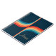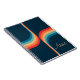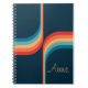 Ilustracion de diseño geométrico con arcos dobles de estilo retro con rayas turquesa, azul, rojo y beige sobre fondo azul oscuro. Agregue su nombre/monograma o elimine el texto.