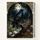 A raven with fantastic, irridescent feathers perches in a gnarled tree under a full moon. An art nouveau arch frames the scene. Beautiful, Gothic image.