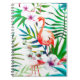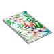 Una obra de arte tropical con flamencos rosas y plantas verdes de selva tropical con flores de hibisco y palmeras sobre un fondo blanco neutro. Una divertida y colorida obra de arte.