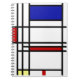 El cuaderno del arte moderno de Mondrian tiene una sección como la composición 10 de Pieter Piet Mondrian en rojo, azul, amarillo, blanco y negro, mejor la saber del grupo del movimiento de arte de Stijl que utilizó tres colores primarios con las líneas negras en un fondo blanco