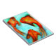 con un diseño artístico original de la pintura acuarela de Sacha Grossel de tres peces naranjas orientales de oro o de Koi nadando en aguas serenas de color agua. Este diseño luminoso y vibrante, inspirado en el arte japonés y asiático para la buena suerte del Feng Shui, deja una impresión duradera.