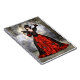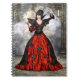 Representación digital en 3D de una hermosa mago hembra con un vestido rojo y negro con alas en un fantástico y espeluznante fondo de castillo